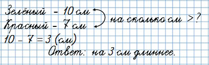 2) На сколько сантиметров длина зелёного отрезка больше, чем длина красного?