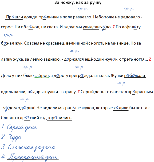 Пр_шли дожди, тр_пинки в поле развезло. Небо тоже не радовало - серое. Ни обл_ков, ни света. И вдруг мы увидели ч_до. По асфал_ту б_жал жук. Совсем не красавец, величиной с ноготь на мизинце. Но за лапку жука, за левую заднюю, - д_ржался ещё один жуч_к, с треть ногтя... Дело у них было ско́рое, а д_рогу прегр_ждала палка. Жучки п_б_жали вдоль палки, п_дпрыгнули и - в траву. Серый день тотчас стал пр_красным - ч_дом од_рил! Не видели мы ран_ше жуков, которые х_дили бы вот так. Словно в де_ский сад тор_пились.