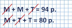 5. Два одинаковых пакета молока и пачка творога стоят 94 р. Две такие же пачки творога и один такой же пакет молока стоят 80 р. На сколько рублей один пакет молока дороже одной пачки творога?