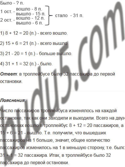 На остановке из троллейбуса вышло 15 пассажиров, а вошло - 8. На следующей остановке вышло 6 пассажиров и вошло - 12. Сколько пассажиров было до первой остановки, если после второй их стало 31?