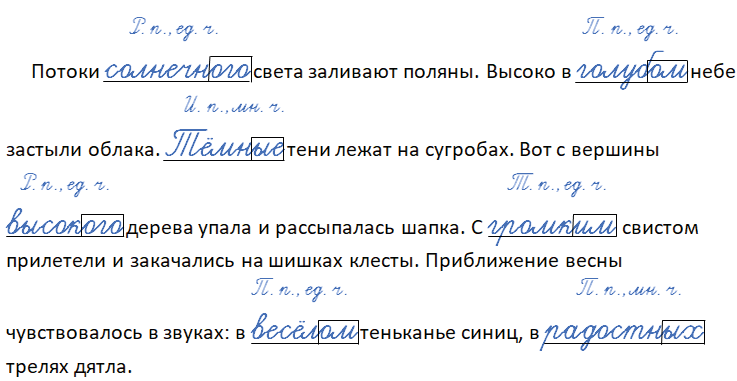 Потоки __________ света заливают поляны. Высоко в __________ небе застыли облака. __________ тени лежат на сугробах. Вот с вершины __________ дерева упала и рассыпалась шапка. С __________ свистом прилетели и закачались на шишках клесты. Приближение весны чувствовалось в звуках: в __________ теньканье синиц, в __________ трелях дятла.