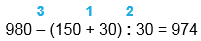 1) 150 + 30 = 180 2) 180 : 30 = 6 3) 980 - 6 = 974 |