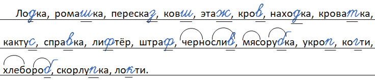 Ло_ка, рома_ка, переска_, ков_, эта_, кро_, нахо_ка, крова_ка, какту_, спра_ка, ли_тёр, штра_, черносли_, мясору_ка, укро_, ко_ти, хлеборо_, скорлу_ка, ло_ти.