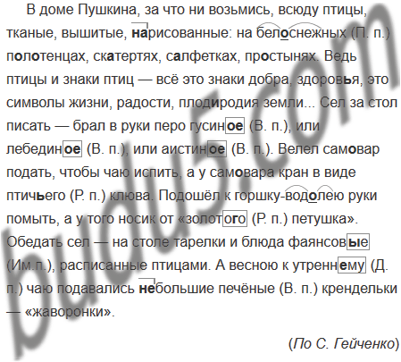 В доме Пушкина, за что ни возьмись, всюду птицы, тканые, вышитые, (на)рисованные: на бел..снежных п..л..тенцах, ск..тертях, с..лфетках, пр..стынях. Ведь птицы и знаки птиц — всё это знаки добра, здоров(?)я, это символы жизни, радости, плод..родия земли... Сел за стол писать — брал в руки перо гусин.., или лебедин.., или аистин... Велел сам..вар подать, чтобы чаю испить, а у сам..вара кран в виде птич(?)его клюва. Подошёл к горшку-вод..лею руки помыть, а у того носик от «золото..о петушка». Обедать сел — на столе тарелки и блюда фаянсов..е, расписанные птицами. А весною к утренн..му чаю подавались (не)большие печёные крендельки — «жаворонки».