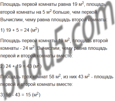 Задание № 3. Площадь трёх комнат 58 м2. Площадь первой комнаты равна 19 м2, а площадь второй комнаты на 5м2 больше, чем первой. Чему равна площадь третьей комнаты?
