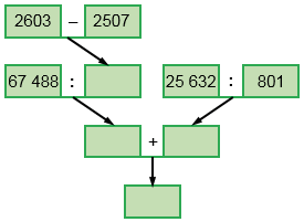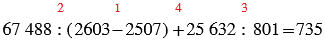 67 488 : (2603 - 2507) + 25 632 : 801