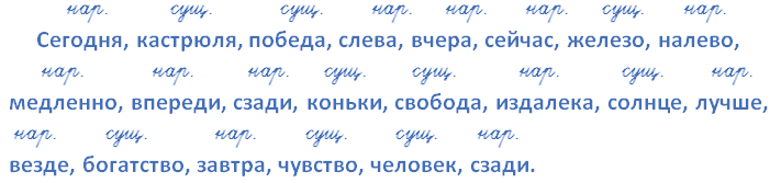 Наречия: сейчас, приветливо, сегодня, справа, налево, теперь, везде.